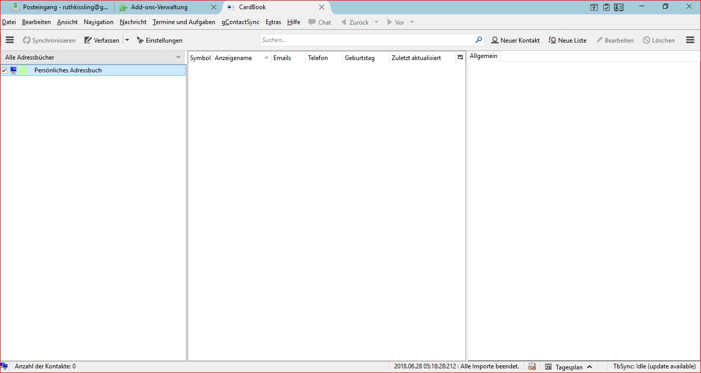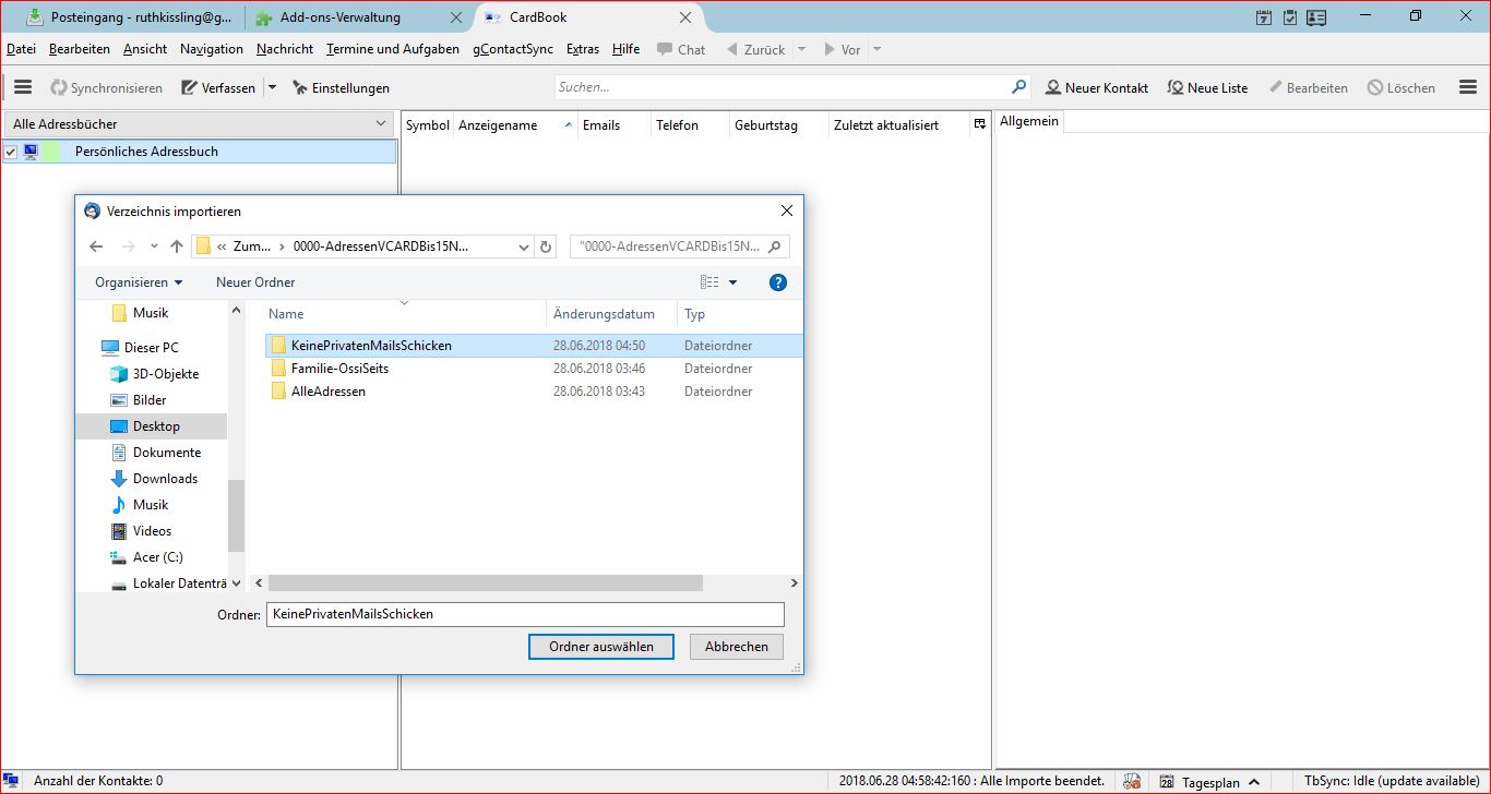 MEIN ERSTES UND VORAB GRÖSSTES PROBLEM IST : Ich kann meine Adressen VCARDs vom Compu nicht importieren ! Einzeln zwar schon aber nicht alle zusammen. Es gibt zwar Apps, doch diese sind von Tempi passati. Ich habe fast 4000 selber gesammelte e-MailAdressen. KommaGetrennt und alle anderen Möglichkeiten gehen auch nicht, weil es ChrusiMusi rauskommt in Thunderbird, quasi fetzenweise. Diese Variante würde gehen : https://www.youtube.com/watch?v=JRr2aOzagbc. Doch ist es eine frühere Version von Thunderbird und dann passt es nicht, geht nicht.