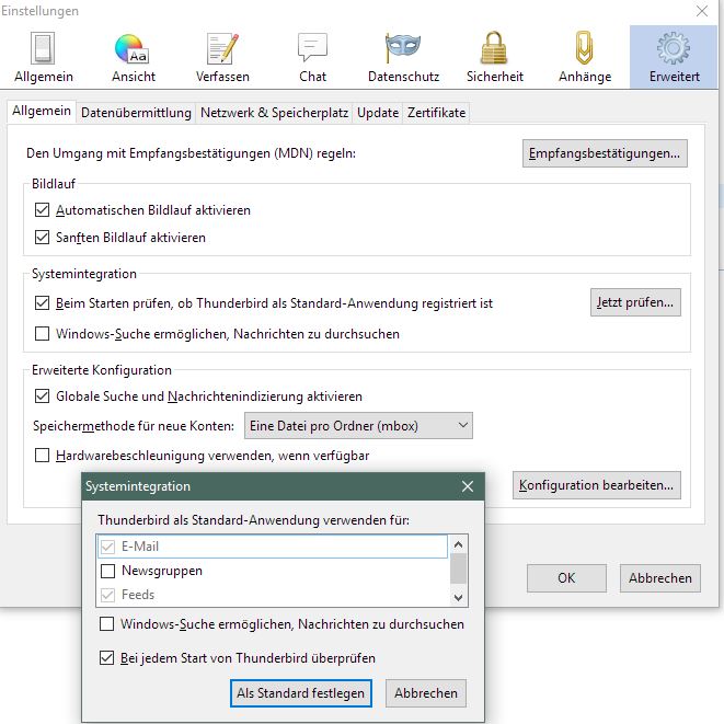 ich habe mich hier angemeldet, da ich folgendes Problem habe: ich möchte eine .pdf als Anhang aus dem Acrobat Reader raus versenden, dort unter dem Briefumschlag --> "Datei als Email senden" bzw. über Datei --> Datei per E-mail senden --> An E-mail anhängen. Es öffnet sich dann immernoch Windows Live Mail, was vorher als Standard-Email-Programm genutzt wurde. Unter Standardprogramme habe ich bereits Thunderbird eingetragen, unter "Standard-Apps nach Protokoll" steht unter Mailto auch bereits Thunderbird. Sicherlich gibt es noch irgendwo eine Verknüpfung, dass immer noch Windows Live Mail als Standard festgelegt ist, aber ich weiß nun nicht mehr, was ich noch machen kann.