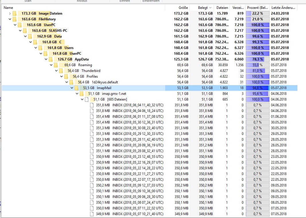 Habe heute die Meldung bekommen gehabt das mein Laufwerk voll war. Also habe ich nachgeschaut woran das liegen könnte mit TreeSize. Bin dann schnell drauf gekommen, dass Thunderbird daran schuld ist. Im Thunderbird Profil Ordner liegen über 50GB Daten drin. Das ist doch viel zu viel. Woran liegt das?