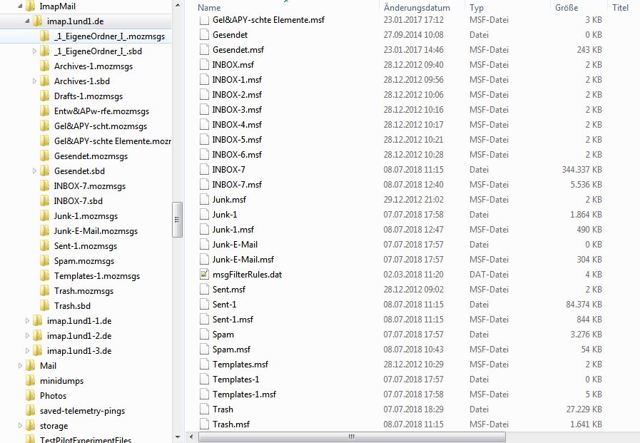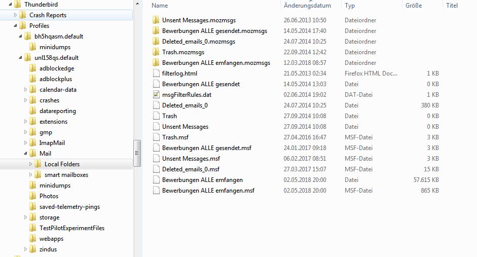 Man sieht außerdem, dass du die Lokalen Ordner (Local Folders) zum Speichern von Nachrichten benutzt, aber die einzige Mailbox-Datei von Bedeutung ist "Bewerbungen alle empfangen" mit etwa 57 MB. Den Rest kann man vergessen, insbesondere den Schmarren mit den *.mozmsgs Ordnern, die von der Windows-Suche erstellt werden.