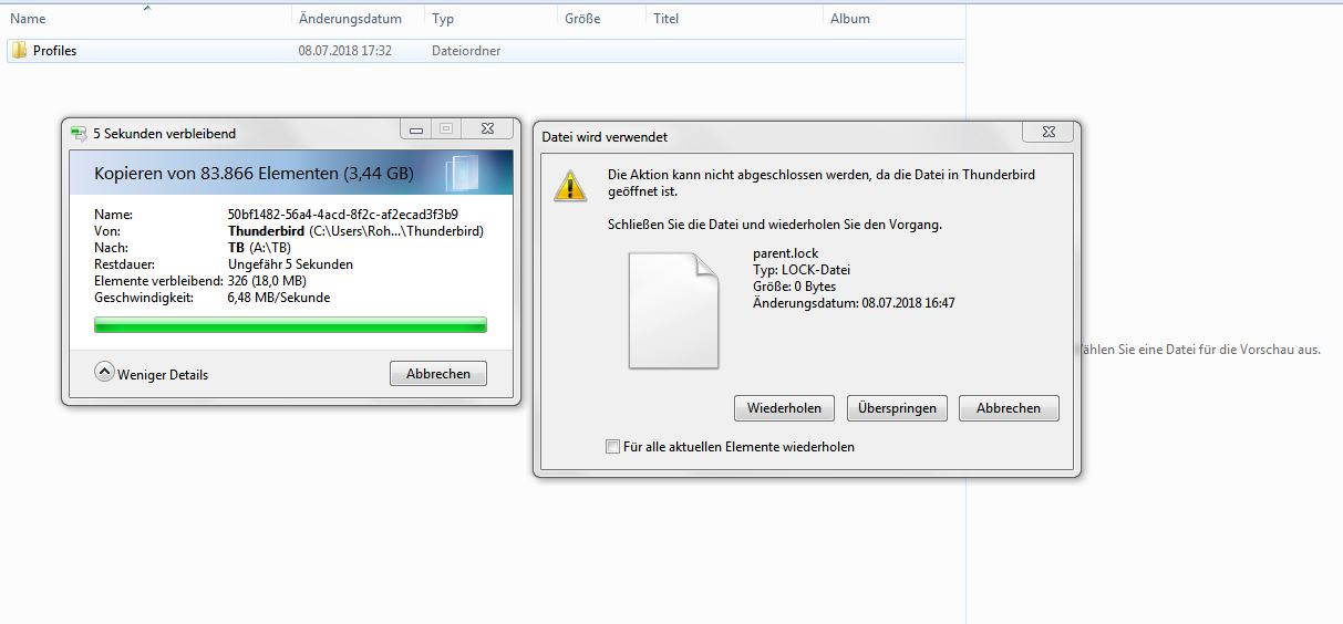 Korrekt. In solchen Fällen kann man nur probieren, einen kurzen Zielpfad zu versuchen wie z.B. "D:\TB\..." oder in der Art. Da der Quellpfad (zumindest standardmäßig) "C:\Users\%username%\AppData\Roaming\Thunderbird\..." lautet, sollte der deutlich kürzere Pfad für die Kopie nicht mehr zur Meldung des zu langen Dateinamens führen. Passiert es dennoch, dann waren schon originale Pfadangaben zu lang und das wäre eine von vermutlich mehreren Ursachen für die vorherigen Probleme.