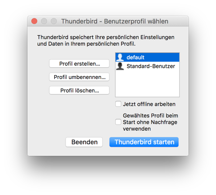 Bevor du im Profil-Manager das neue Profil erstellst, würde ich zunächst den Haken entfernen bei "Gewähltes Profil beim Start ohne Nachfrage verwenden." Dann wird sich bei den zukünftigen Starts von Thunderbird jedes Mal dieses Fenster des Profil-Managers öffnen und du kannst Thunderbird wahlweise im alten oder im neuen Profil öffnen.