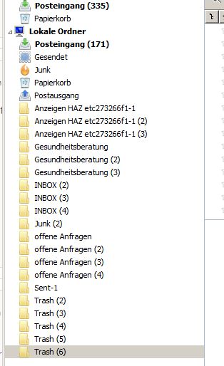 Ich öffne TB und er hat die Ordnerstruktur mit allen vier Untermailkonten drin und zeigt mir ganz kurz an, dass über 4000 Mails im Posteingang sind, sobald er jedoch anfängt aktuelle Mails vom Server nachzuladen (was er automatisch sofort nach dem Start tut), sind diese nicht mehr sichtbar und nur noch der aktuelle Bestand, der auch auf dem Server ist, vorhanden (ca. 300 Mails).