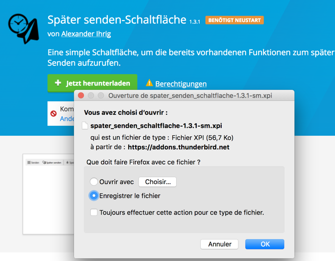Ich bin noxhmals auf die neue Addons-Seite von Thunderbird zurück gekehrt und habe erneut den Button "Jetzt herunterladen" mit dem Links-Klick getestet. Offenbar wurde die Seite bzw. der Button überarbeitet, denn jetzt genügt bei mir tatsächlich wieder der einfache Klick auf den Button, um direkt das Download-Dialogfenster aufzurufen: