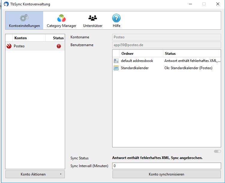 Habe es jetzt doch selbst herausgefunden (für posteo):TbSyncAccount Manager -> Account actions -> Add new account -> sabre/dav