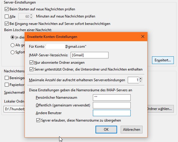 Die IMAP-Ordner "Alle Nachrichten", "Markiert" und "Wichtig" würde ich unter dem Punkt "IMAP-Ordner abbonieren" ausblenden, denn die Nachrichten in diesen Ordnern sind doppelt (virtuelle Ordner).