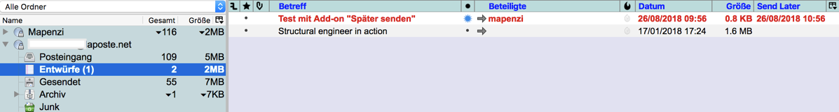 Wenn man das Add-on "Später senden" installiert hat, kann man auch eine bestimmte Sendezeit programmieren. In diesem Fall wird die Nachricht bis zum Sendezeitpunkt im Ordner "Entwürfe" zwischengespeichert: