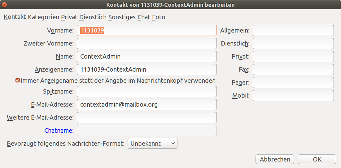 Mein globales Adressbuch, dass mit mailbox.org synchronisiert wird, enthält in Thunderbird folgenden Eintrag, der auf mailbox.org nicht zu sehen ist. Man kann den Eintrag in Thunderbird löschen, aber nach der nächsten Synchronisation mit mailbox.org ist er wieder da.