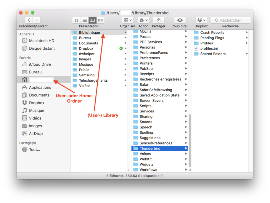 NUR: Wo ist der Profilesordner von Thunderbird? Da sollen ja angeblich alle Mails etc. drin sein. Dieser Ordner soll angeblich ein Unterorder von Librarys/Thunderbird sein. Ich habe 2 Library-Ordner, einen in dem Ordner System und einen direkt im Stammverzeichnis. In keinem der beiden ist der Ordner Thunderbird, geschweige denn Profiles zu finden.