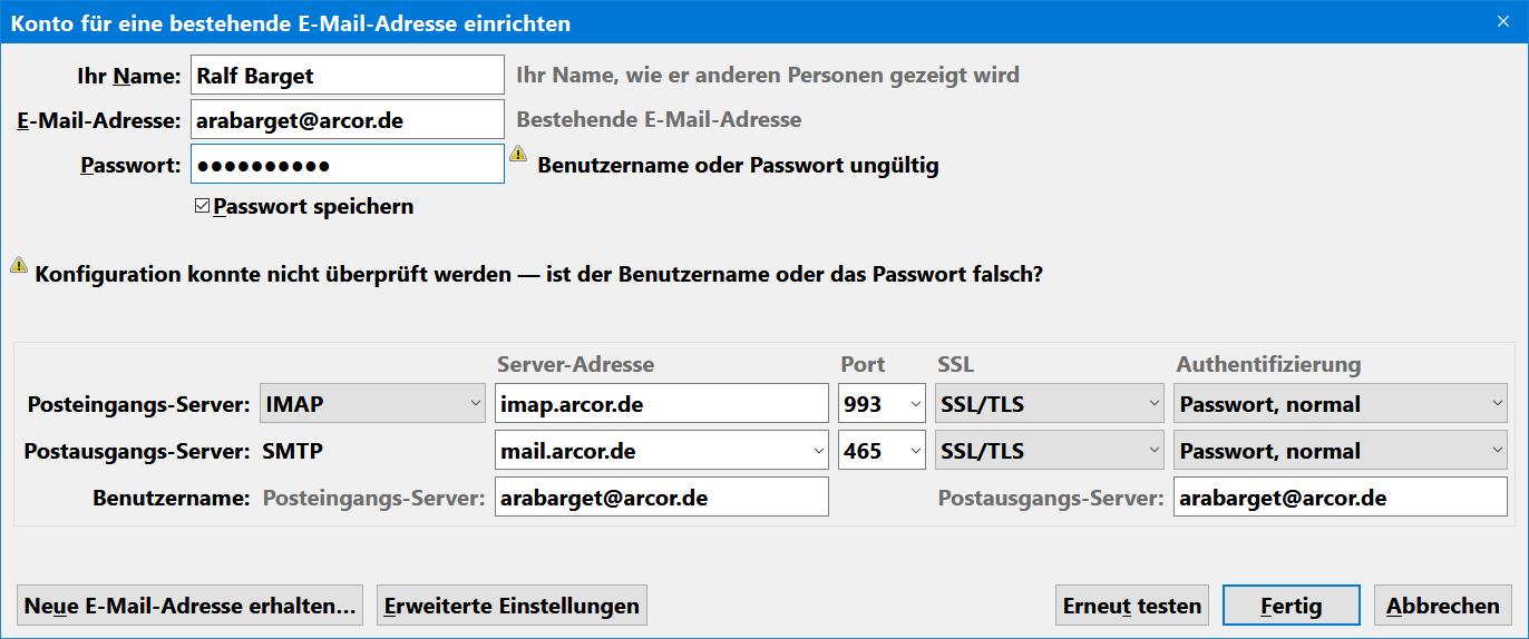 Habe den Thunderbird neu aufgespielt und meine Daten so wie sie immer waren eingegeben.Also Benutzername , Passwort ect. nun bekomme ich ständig die Meldung falsches Passwort oder Benutzename. Es aknn an Thunderbird nicht liegen, denn mein GMX postfach konnte ich anlegen ohne Probleme.