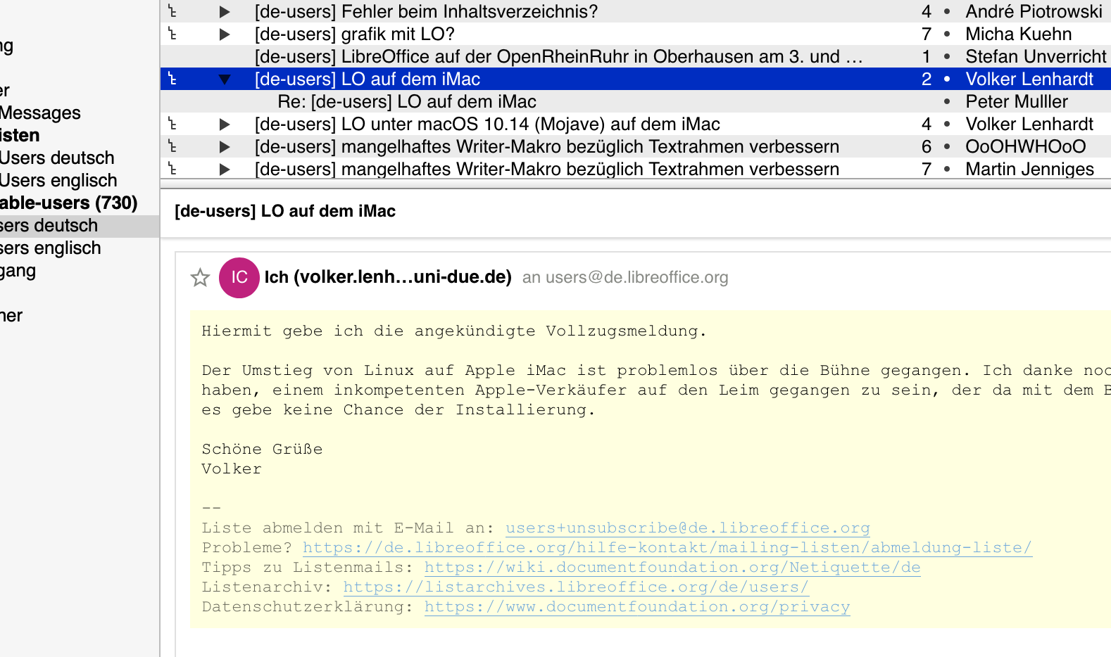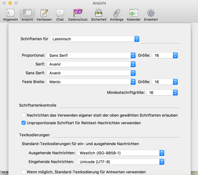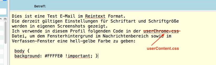 Die Darstellung des Nachrichtentexts (reiner Text) sollte Schwarz auf Hellgelb sein. Der Text ist aber nur mittelgrau, auch beim Verfassen einer Nachricht. In den Einstellungen habe ich unter Farben das dunkelste Farbfeld ausgewählt. Es wird nicht dunkler als mittelgrau. Die Einstellung anderer Farben ist möglich. Unter Linux ist alles gut.