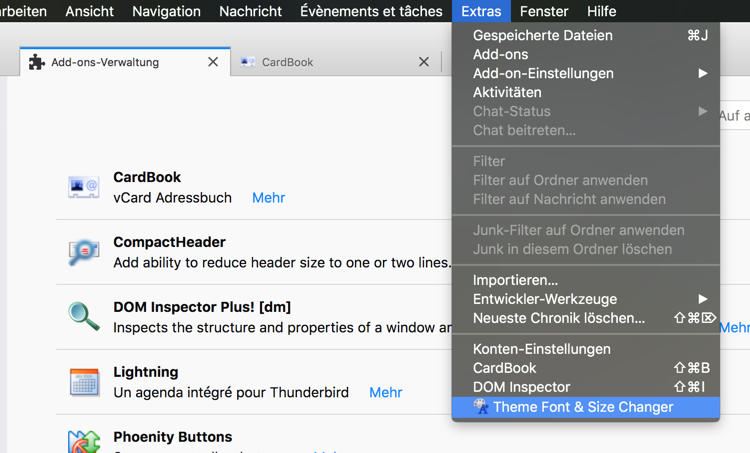 Um das Add-on in einem neuen Tab zu öffnen, musst du in der Menüleiste auf "Extras" klicken und in dem sich aufrollenden Untermenü das Item "Theme Font & Size Changer" mit dem Mauszeiger anklicken:
