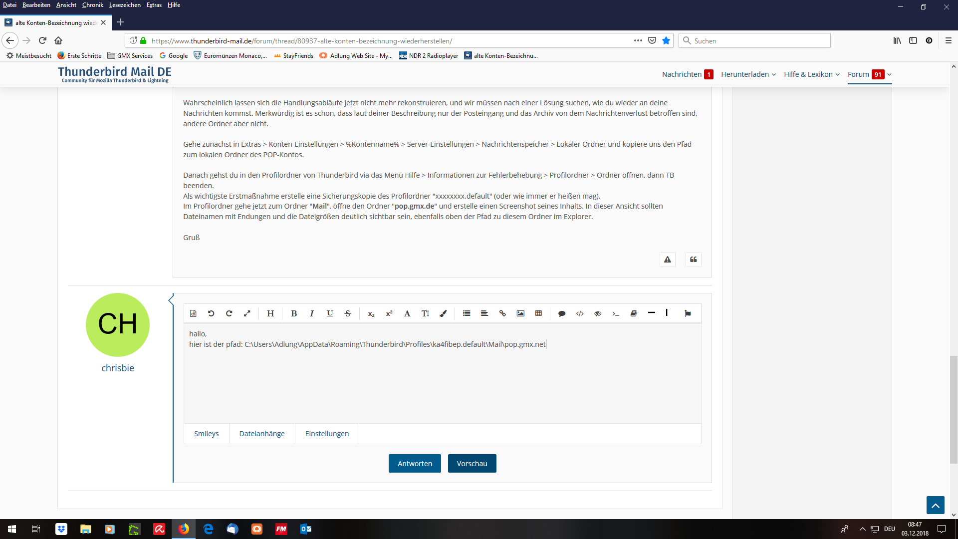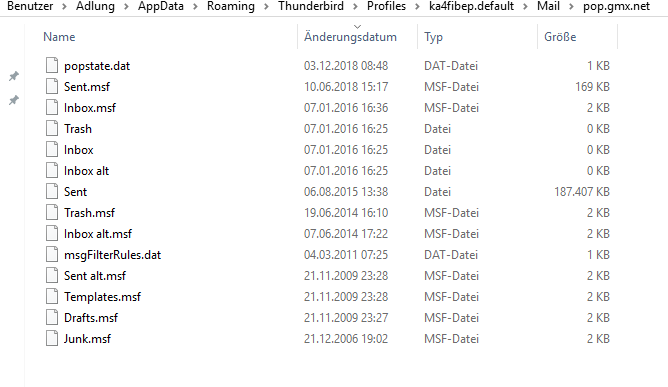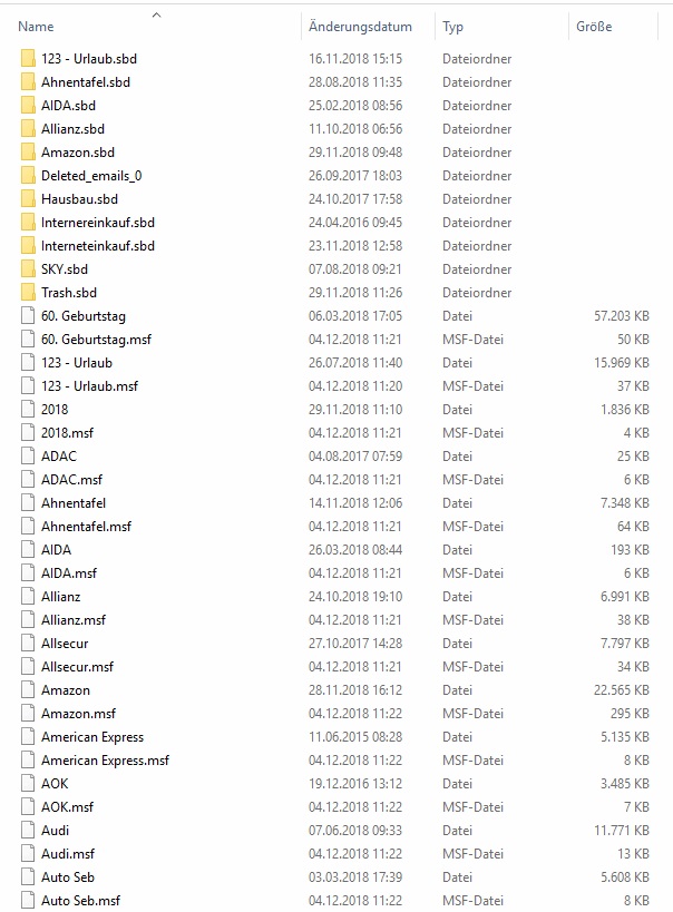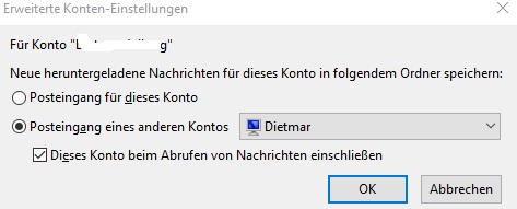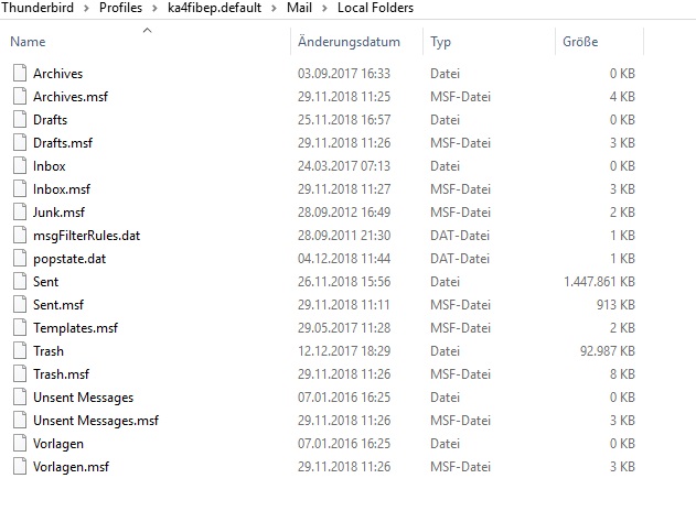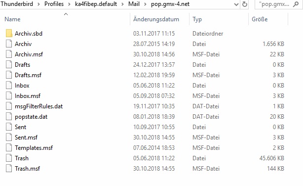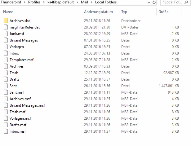Ich hab heute bei den Kontoeinstellungen den Namen geändert, weil es eine Fehlermeldung für den Speicherort (lokaler Ordner) C:\User\%Benutzer%\AppData\Roaming\Thunderbird\Profiles\ ... gab mit dem sinngemäßen Hinweis: kein geeigneter Speicherort! Die alte Kontobezeichnung bestand aus meinem Vor- und Zunamen. Die Änderung führte dazu, dass alle Mails im Eingang sowie das Archiv komplett nicht mehr sichtbar sind.