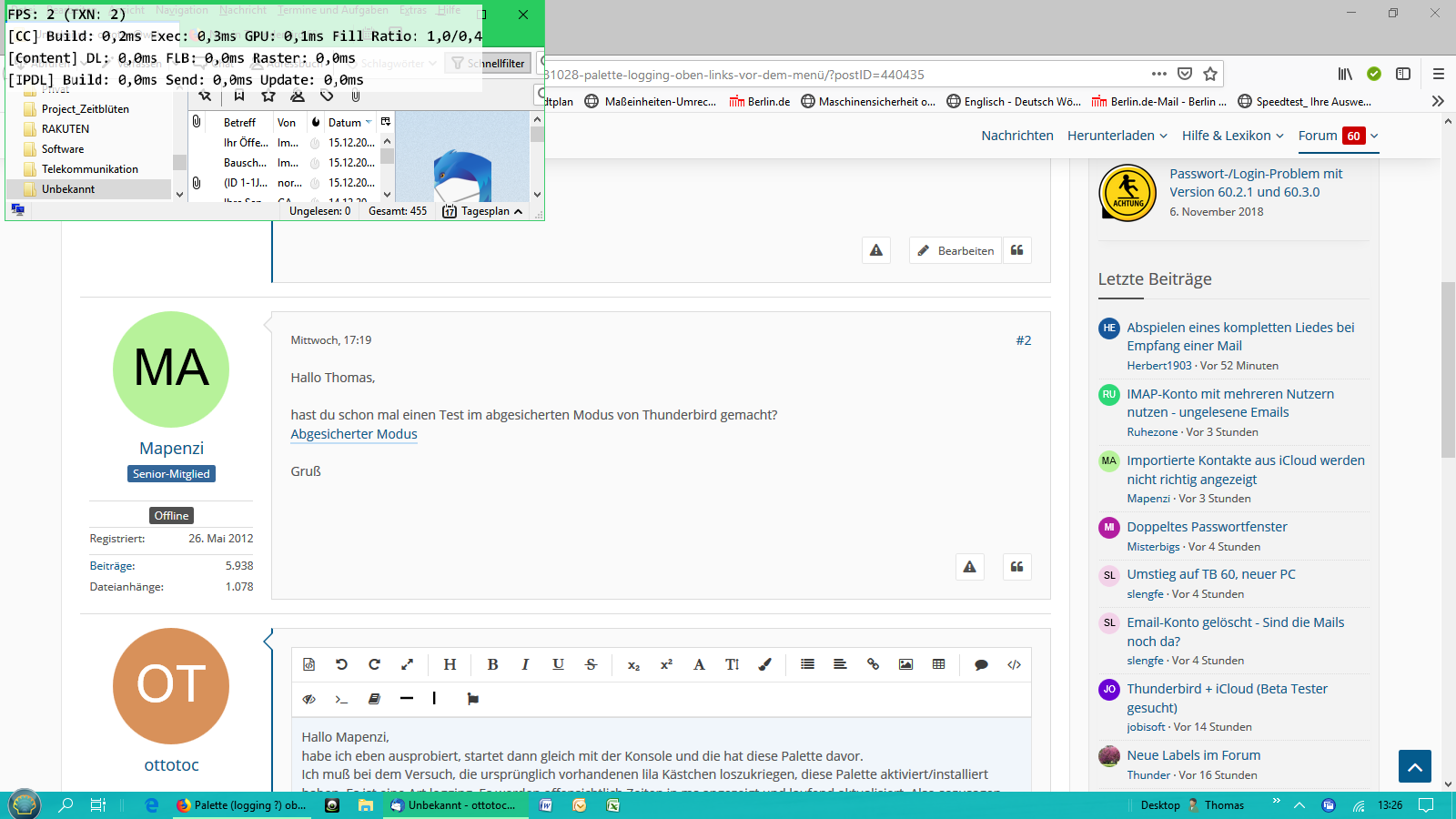 Hallo, ich habe beim Thunderbird oben links vor dem Menü eine teiltransparente Palette mit vier Zeilen in der Zeitwerte in ms angezeigt werden. Wenn ich die Browser Konsole öffne, habe ich dort auch oben links die gleiche Palette. Urspr. waren dort drei lila Felder mit je drei Ziffern zu sehen. Wie kriege ich das wieder weg ?