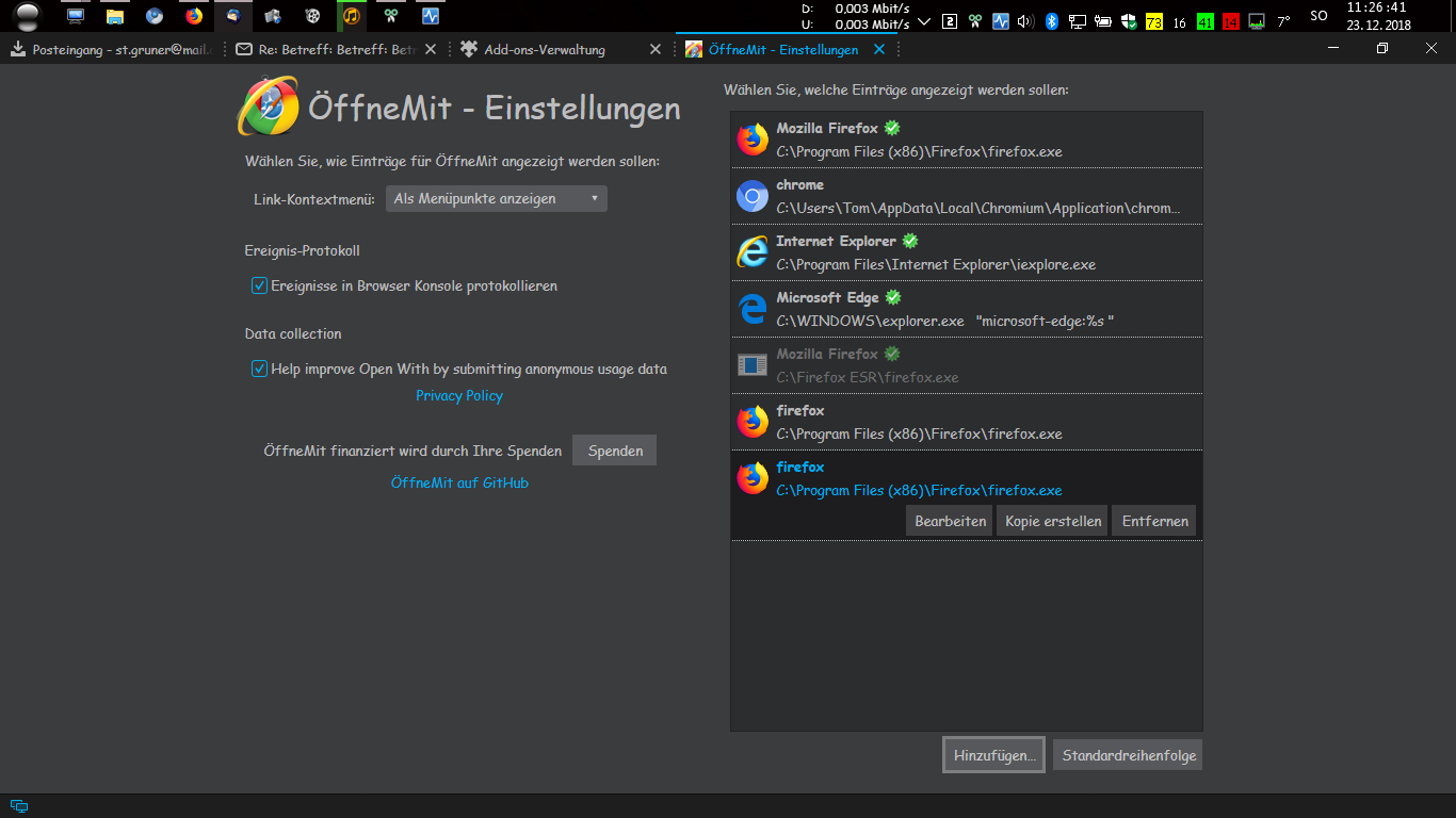 Ich nutze schon dies hier: http://kb.mozillazine.org/Changing_the_w…ser_invoked_by_ (siehe Screenshot) um Links aus Emails an verschiedene Browser zu senden.
