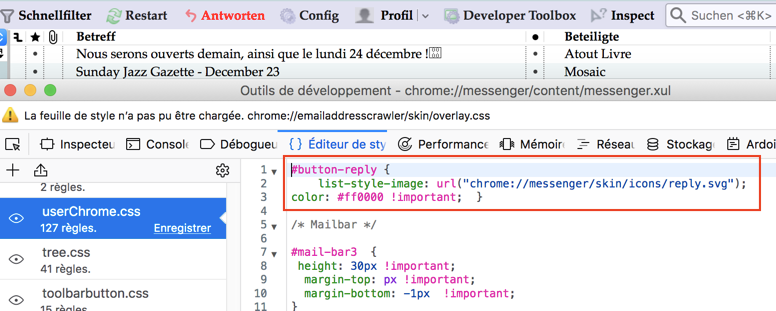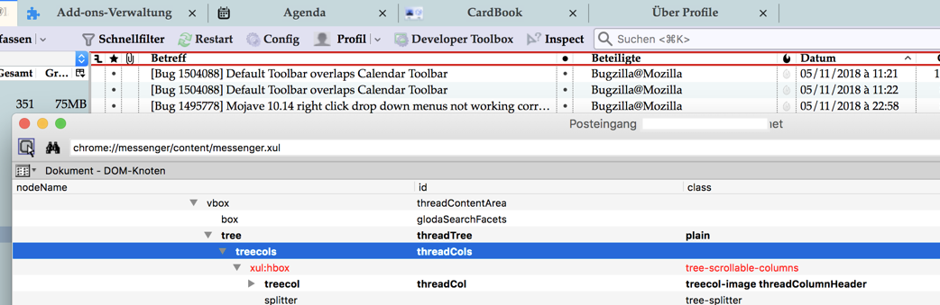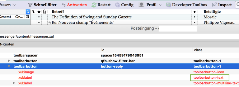 Wenn ich die Bezeichnung (ID) eines Elements suche, benutze ich immer noch die Erweiterung "DOM Inspector Plus" https://addons.thunderbird.net/en-US/thunderb…m-inspector-dm/ zusammen mit der Erweiterung "InspectorWidget" https://addons.thunderbird.net/en-US/thunderb…nspectorwidget/