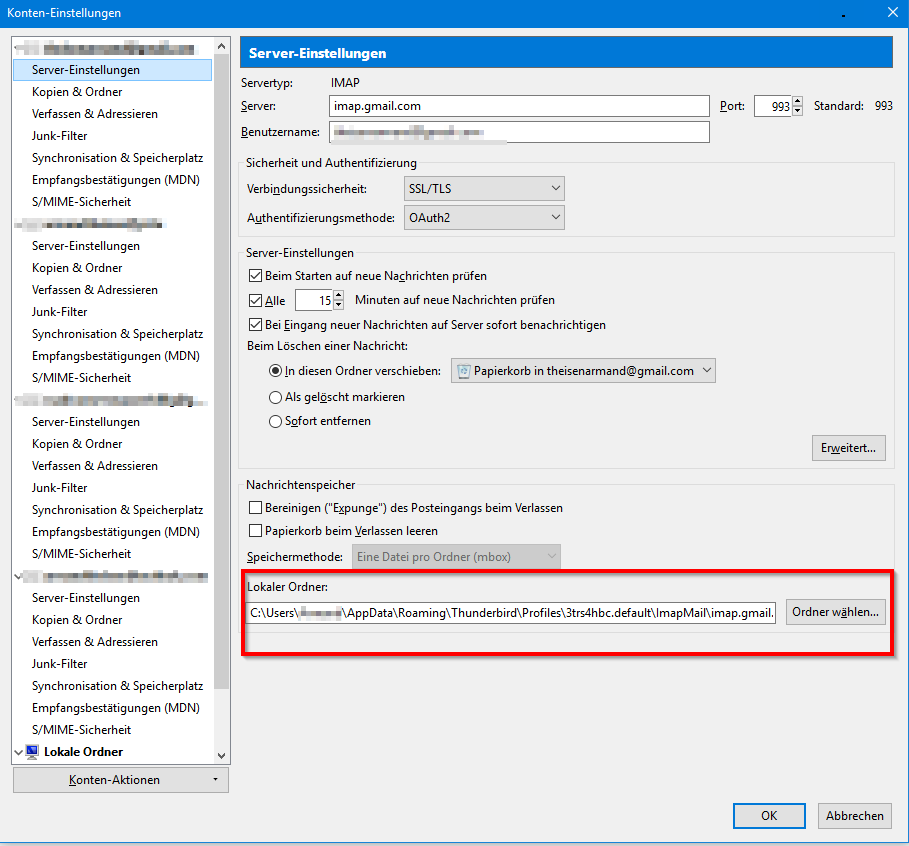 Nach einem Umzug des Tb-Profils auf eine andere Festplatte werden in den Konten nur noch Eingang und Papierkorb angezeigt. diese Erscheinung trifft für alle meine Accounts zu. Als Test habe ich ein Account mit SeaMonkey im gleich Pc und HDD eingerichtet. da sind alle Ordner vorhanden. Was habe ich falsch gemacht, Ich bitte um Hilfe, weil ich Tb gerne weiter verwenden möchte.