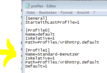 Hast du die Datei profiles.ini überprüft und ist dort das neue Profil aufgeführt? Wenn ja, bitte den neuen Inhalt kopieren.