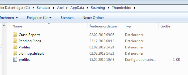 Im Screenshot mit dem Inhalt des Ordners "Thunderbird" fällt auf, dass sich darin ebenfalls der Profilordner "vr6hntrp.default" befindet, der aber nicht in dieses Verzeichnis gehört. Das hat allerdings Thunderbird nicht selber bewerkstelligt, da muss ein hilfreiches Händchen am Werk gewesen sein ;)