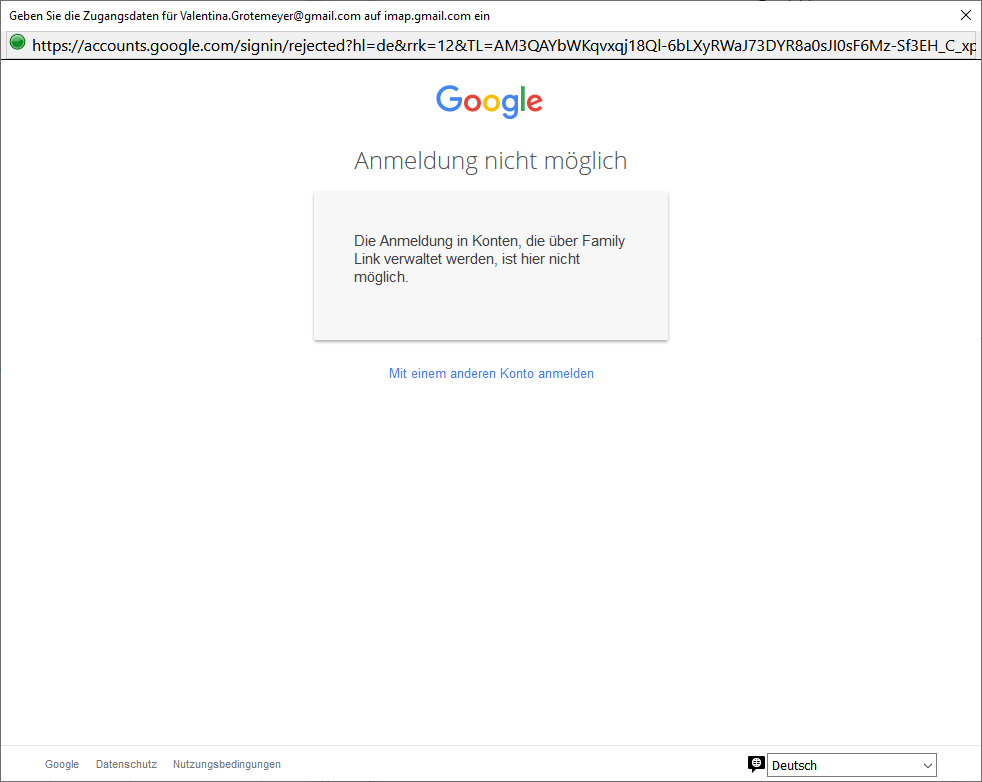 ich habe für meinen minderjährigen Sohn bei Google eine Emailadresse eingerichtet die aber auf Grund seines Alters über den Family Link scheinbar von mir aus noch mit „verwaltet“ werden muss.