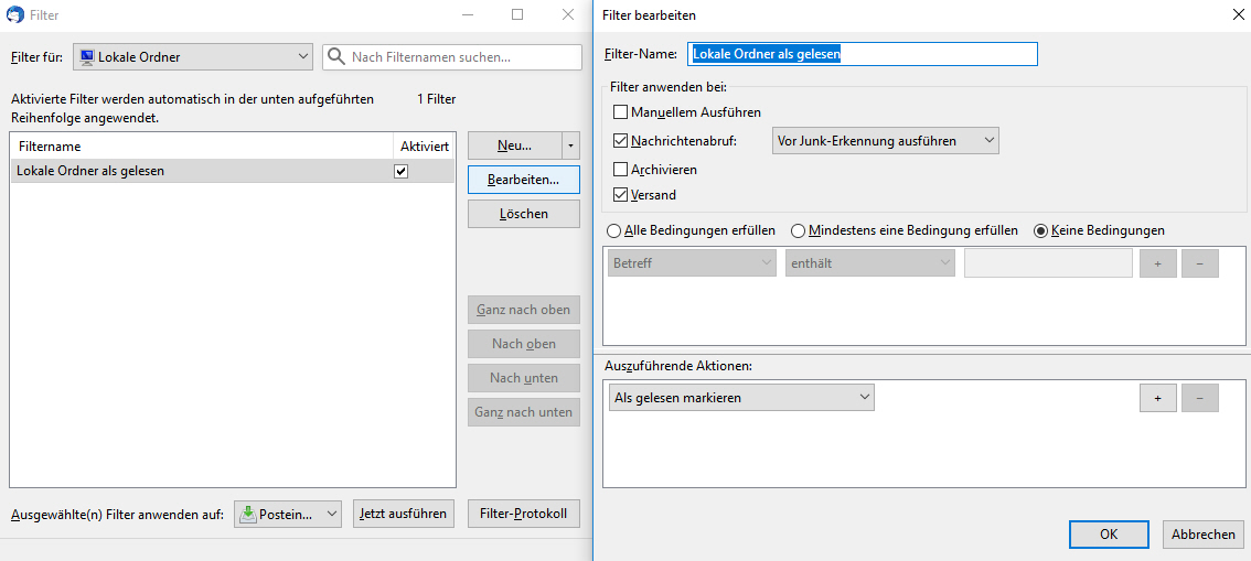 Ich habe nun einen Filter auf die Inbox im Lokale Ordner gesetzt (siehe Abbildung). Leider funktioniert der nicht. Wie kann ich alle Mails in der Inbox unter Lokale Ordner automatisch auf gelesen setzen?