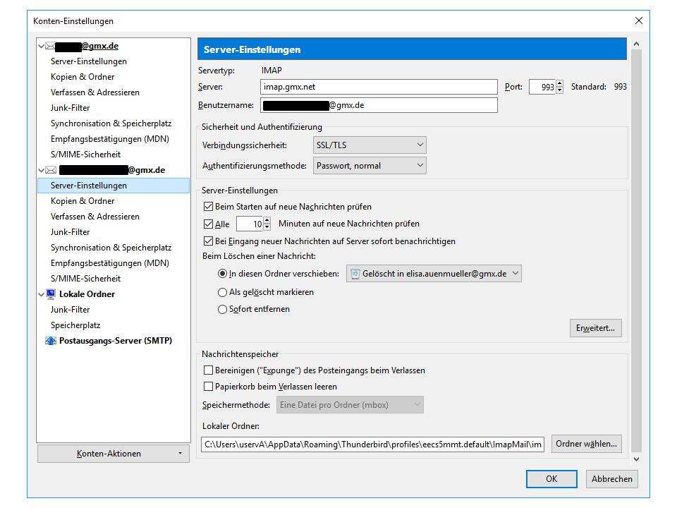kürzlich habe ich in TB ein zweites Konto (Bild Konten2) erstellt, so dass ich aus zwei Mail-Accounts die Mails angezeigt bekomme. Funktioniert soweit problemlos. Seither sehe ich aber die ehemals im ersten Account (Bild Konten1) angelegte Ordnerstruktur nicht mehr. Diese Mails habe ich auf eine NAS ausgelagert (was ich wohl nicht hätte tun sollen, ohne auch das Profil ebenfalls auszulagern). In dem betreffenden Verzeichnis befinden sich ca. 50 Ordner und 2GB an Daten, unter anderem auch INBOX-1 mit ca. 450 MB und auch eine Sent mit ca. 1 GB, es ist wohl noch alles da. Ebenso die Ordnerstruktur ist hier erhalten.