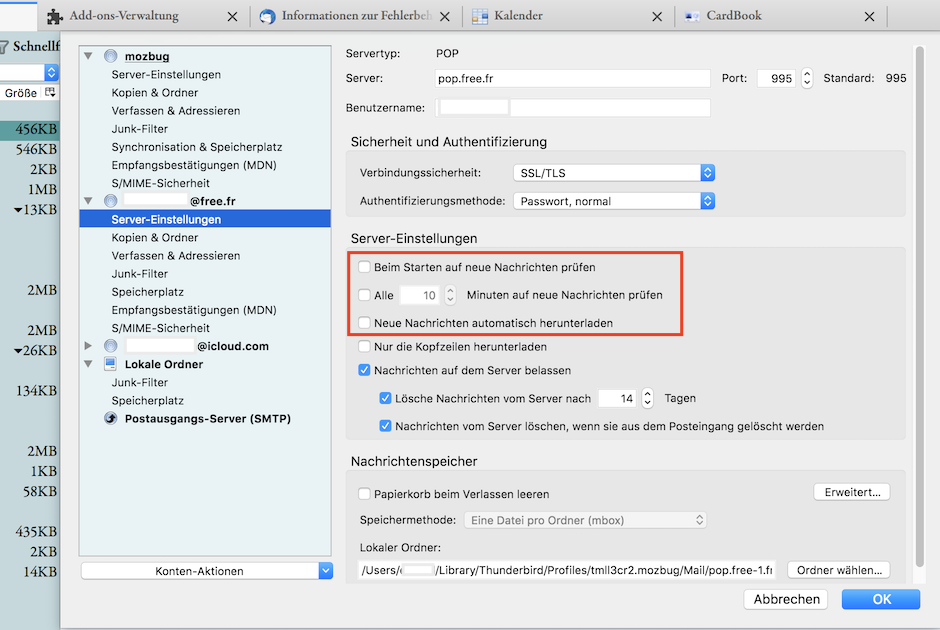 Um zu vermeiden, daß sich die Mails dort nun unendlich sammelten habe ich die Server-Einstellung dort (also im Lokalen Ordner) so eingestellt, daß die Mails automatisch nach 5 Tagen gelöscht werden.