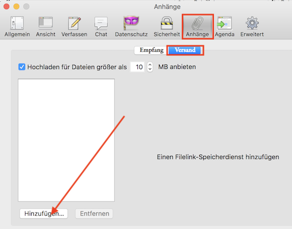 Im Fenster der Einstellungen Klick auf den Reiter "Anhänge" > "Versand" > "Hinzufügen":