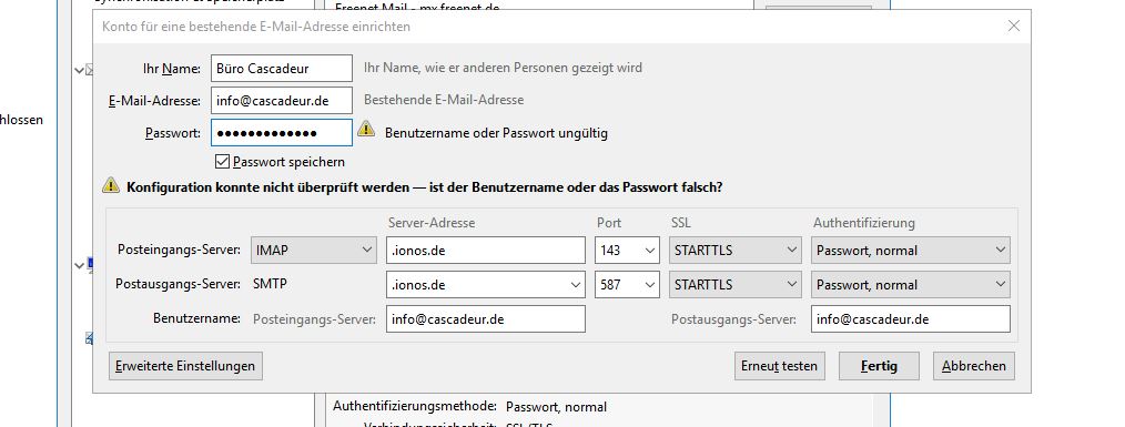 Da ich den Provider wechselte habe ich mein emailkonto zuerst entfernt. Dieselbe emailadresse habe ich dann mit neuem Provider (IONOS) und neuem Passwort wieder versucht einzurichten.