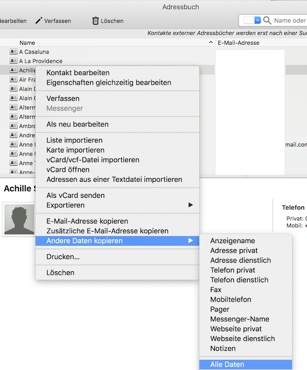 Kopieren einer einzelnen Adresse aus Adressbuch