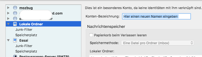 Die Datei lässt sich auch wiederherstellen, allerdings wird dabei mein alter gmx Account (das untereste in meiner Kontenliste und damit vermutlich "Default"-Konto) als lokaler Ordner eingerichtet. Dies ist recht blöd, da es scheinbar bedeutet, dass ich die Konteneinstellungen nicht ändern kann. Wenn ich auf Kontoeinstellungen klicke heißt es: "The following is a special account. There are no identities associated with it". Auch die ganzen anderen Tabs, die bei anderen Konten in den Konteneinstellungen angezeigt werden (Servereinstellungen, etc), fehlen für das gmx Konto. Das ist natürlich ziemlich unpraktisch - ich möchte das gmx Konto nämlich zum Beispiel in ein Pop3-Konto umwandeln, damit ich mich zum Löschen von emails nicht immer auf der gmx Seite einloggen muss (Hoffe, ich hab das mit Pop3/IMAP richtig verstanden). Dies ist jedoch scheinbar nicht möglich, da man den lokalen Ordner nicht so konfigurieren kann wie andere Konten.