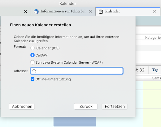 Ich habe meinen Apple (iCloud) Kalender über den Radiobutton ⦿ CalDav eingebunden:
