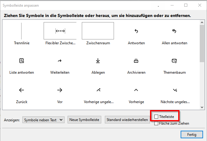 Könnte man jetzt noch die obere Zeile ausblenden? Also die, wo jetzt Junk - Lokale Ordner - Mozilla Thunderbird steht. Dann müssten allerdings die 3 Icons, ganz rechts, in die Symbolleiste/Menüleiste rutschen.