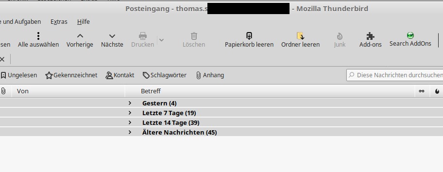 Gibt es eine Option, um bei der Sortierung der Emails im Eingang nach Datum absteigend (neueste oben) und gruppierter Anzeige (heute, gestern, letzte Woche, ...) alle Gruppen immer ausgeklappt anzuzeigen, auch bei Neustart oder Ordnerwechsel?