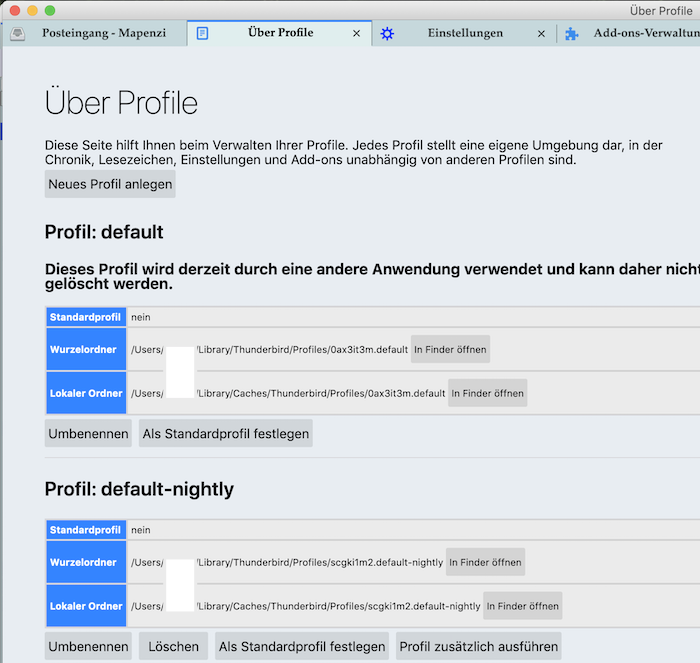 War eben auf der Seite Profilordner - Wo ist er zu finden?, weil ich auf einer Seite ein Info gefunden hatte, daß man eine bestimmte Einstellung "zu Fuß" per Bearbeitung einer Konfig-Datei machen müßte, die in eben diesem Profilordner liegen würde. Leider enthält diese Seite entgegen des Titels aber gar keine Infos, wie man seinen Profilordner findet, das sollte nachgetragen werden!