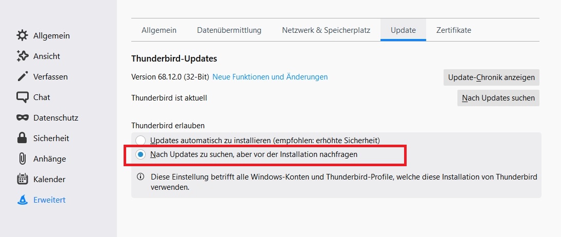 Vorhin beim Aufruf von Thunderbird 68.12.0 kam dann diese Meldung: