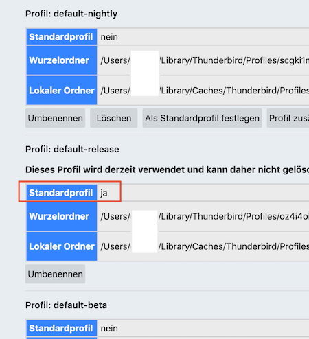 Wenn du Thunderbird startest, zum Menü Hilfe > Informationen zur Fehlerbehebung > about:profiles gehst, wird der Profilmanager in einem Tab geöffnet. Dort kannst du sehen, welches das Standard-Profil ist und wo es liegt: