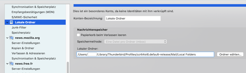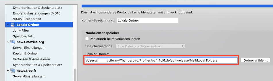 Dann öffne wieder die Konten-Einstellungen, markiere links in der Liste "Lokale Ordner" und kopiere rechts den Pfad zum lokalen Ordner des Nachrichtenspeichers. Ich habe ihn rot umrandet und stelle veränderten meinen Screenshot hier nochmals ein: