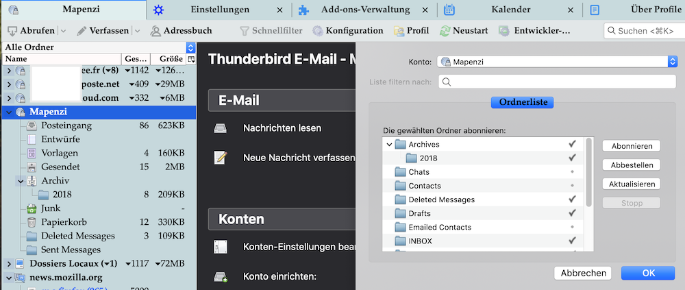 Und was das IMAP-Konto betrifft, so hast du immer noch nicht beantwortet, ob du die Ordner abonnieren konntest. ich frage mich überhaupt, wie du mit diesem Konto arbeiten kannst, wenn außer dem Posteingang kein einziger Ordner sichtbar ist.
