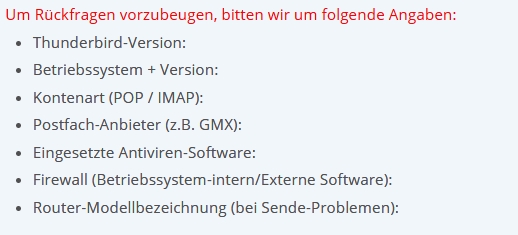 Um dir helfen zu können benötigen wir detaillierte Informationen zu deinem System, dem Thunderbird und das Mailprotokoll.
