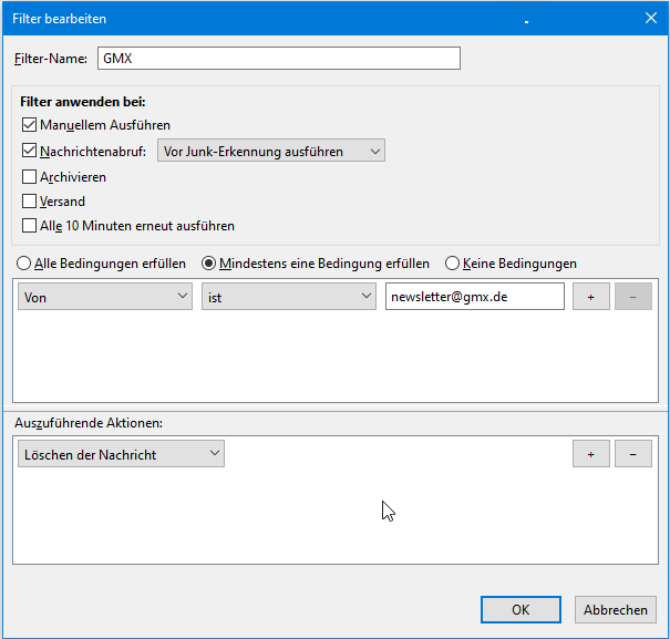 Dein Filter wird nicht funktionieren, da laut Deinen Einstellungen alle Bedingungen erfüllt sein müssen. Nur wird aber die Mailadresse höchstwahrscheinlich weder im Betreff noch im Inhalt der Newsletter stehen. Entferne die diesbezüglichen Kriterien, behalte nur die Bedingung Von = mailings@gmx.net und stelle um auf Mindestens eine Bedingung erfüllen, so wie auf dem Screenshot in Beitrag 30 gezeigt.