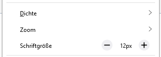 Für die Anpassung der Benutzeroberfläche sollte also "Dichte" und "Schriftgröße" im Menü "Ansicht" verwendet werden.