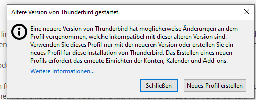 gestern Abend war plötzlich Thunderbird von meinem PC verschwunden... Ich habe keine Ahnung, was da passiert ist. Aufgrund einer ähnlichen Anfrage (hier im Forum??) habe ich TB manuell wieder installiert. Ich scheitere aber damit, meine lokalen Ordner wieder herzustellen. Sie sind offenbar auf meinem PC noch vorhanden (im Anwendungsordner, wie ich hier gelernt habe). Irgendwo habe ich gelesen, nach Neuinstallation hätte man zwei Profile und müsse dann wieder auf das alte gehen. Die Profile, die ich gefunden habe, hießen allerdings beide irgend etwas mit "Default"... Ich bekomme aber eine Meldung, mit der ich nichts anfangen kann (siehe unten). Kann mir jemand weiterhelfen?