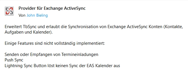 • Sync-Add-on für Online-Adressbuch?: Lightning. Provider Exchange ActiveSync, Provider für Google Kalender, TbSync