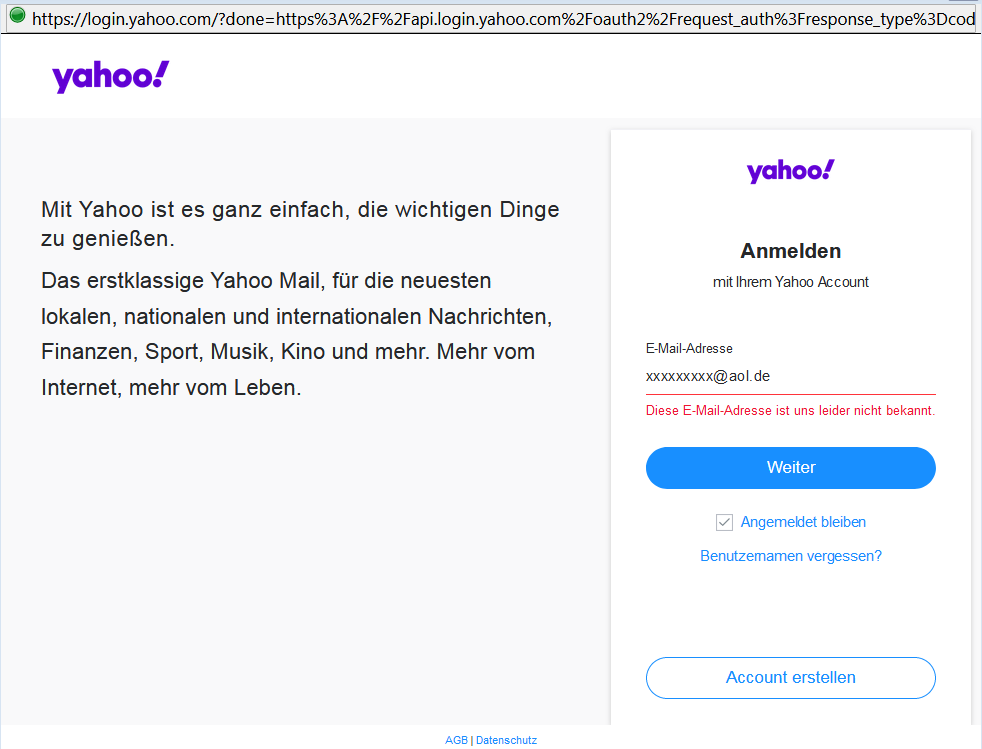 Bei mir ist es nämlich so, dass ich bei Thunderbird zwar die AOL Adresse nebst PAsswort eingeben kann, sich dann aber ein Fenster (Yahoo) öffnet und mir sagt, dass die AOL Adresse bei YAHOO nicht bekannt ist. Insofern kann ich die Einrichtung bei Thunderbird nicht abschließen.