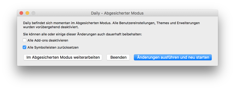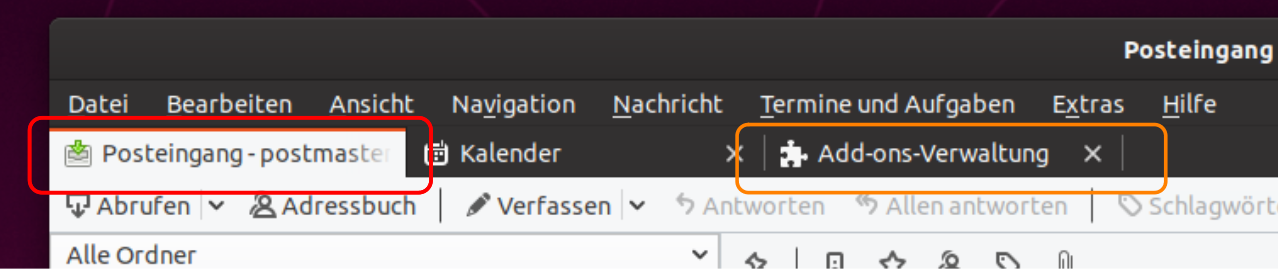 Nur wenn ich die AddOn-Verwaltung aufrufe, wird das Mailfenster/Tab wieder sichtbar.