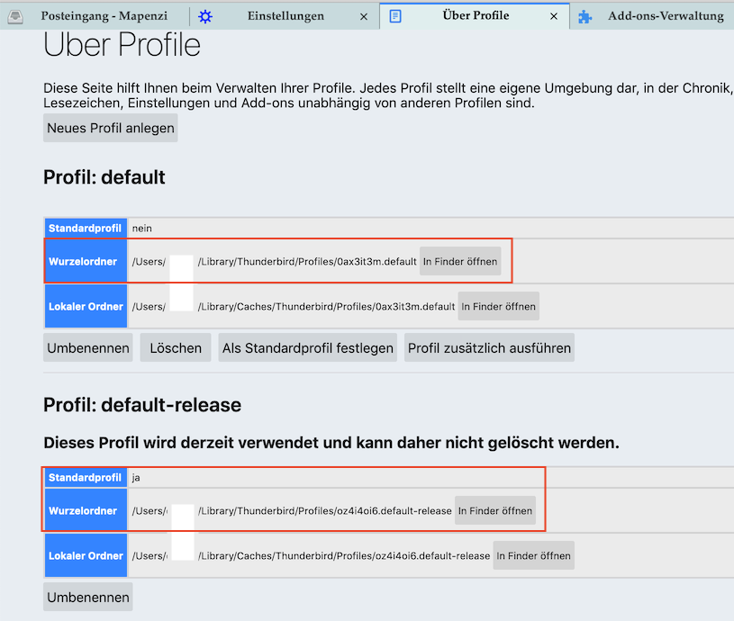 Öffne Thunderbird, gehe zu Hilfe > Informationen zur Fehlerbehebung > Allgemeine Informationen > Profile > auf about:profiles klicken. Es wird ein neuer Tab "Über Profile" geöffnet und du siehst in etwa folgendes Bild:
