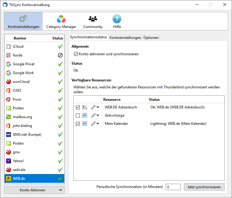 - was mir noch Schwierigkeiten macht sind die Kontakte. Ich habe mehrere Adressbücher im Thunderbird, diese kann ich jedoch beim Synchronisieren nicht abbilden. Bisher sehe ich nur die Möglichkeit, die verschiedenen Kontakte der Adressbücher wild zusammenzuladen (was ich eigentlich nicht möchte)