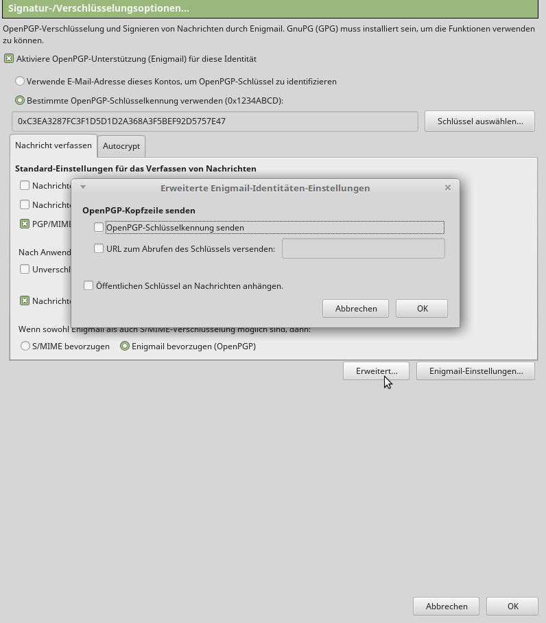 Mein Fenster ist schon mit eingeschalteter Expertenoption. Vielleicht ein Versionsproblem von TB oder EM? Die Möglichkeit "Öffentlicher Schlüssel anhängen" ist ja auch bei mir möglich, ohne "Erweitert"-Button. TB ist aktuell.