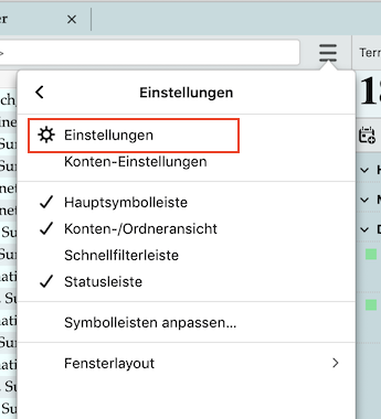 ich bin mit meinem Profil von Windows auf Apple umgezogen. - Soweit kein Problem. Unter dem Menüpunkt "Extras" fand ich bisher (win) unter "Konteneinstellungen" den Punkt "Einstellungen". Dieser fehlt, so dass notwendige Anpassungen nicht vorgenommen werden können. Vor allem die Passwortverwaltung ist nicht erreichbar, funktioniert aber auch nicht. Unter dem Menüpunkt "Thunderbird" kann der Unterpunkt "Einstellungen" nicht geöffnet werden.